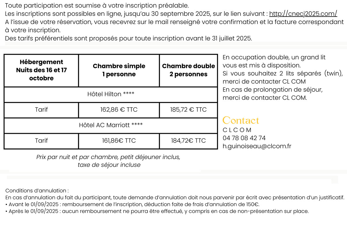 Nous vous invitons à réserver votre hébergement lors de votre inscription au congrès via le formulaire de la CNECJ afin de bénéficier des tarifs préférentiels négociés. Attention : nombre de places limité.